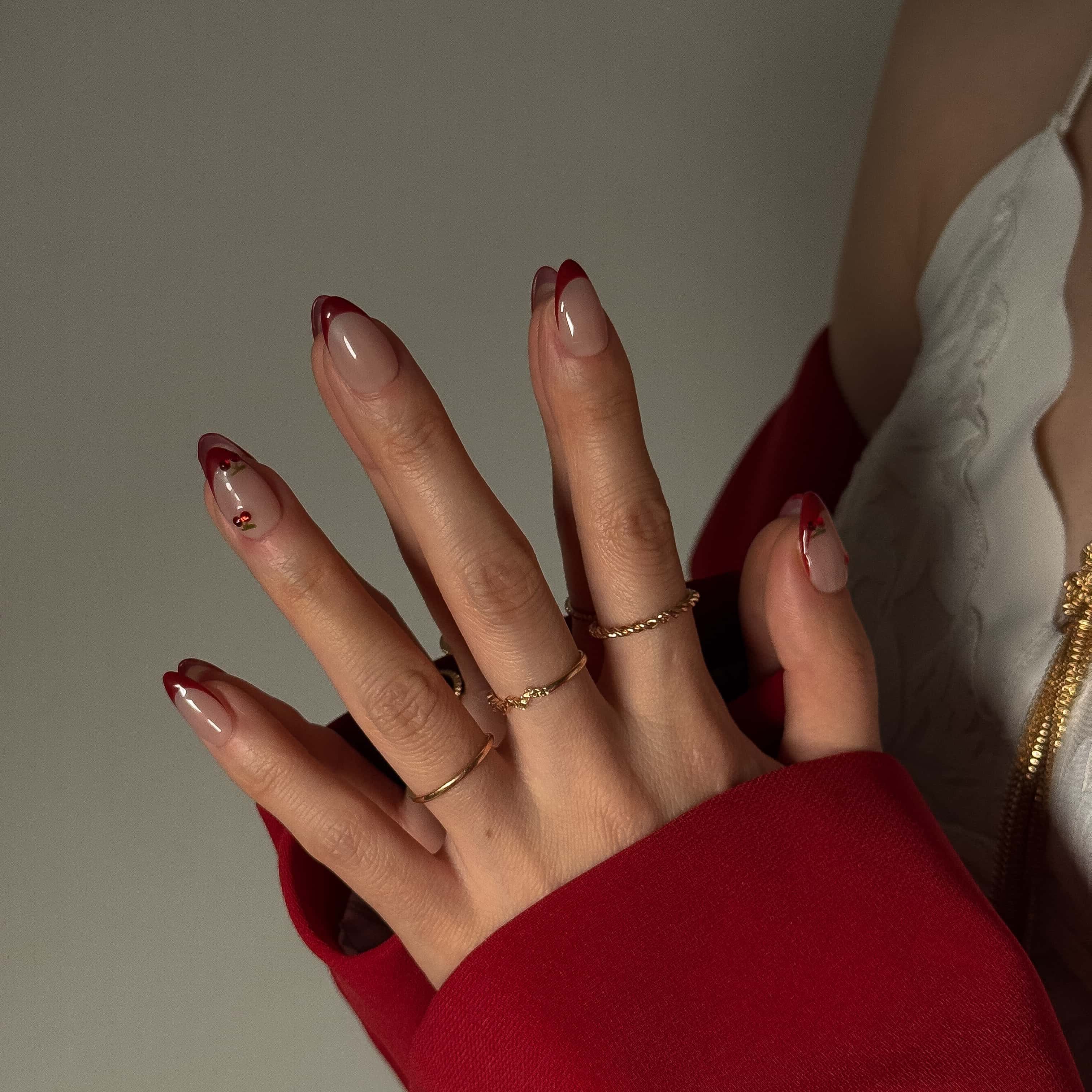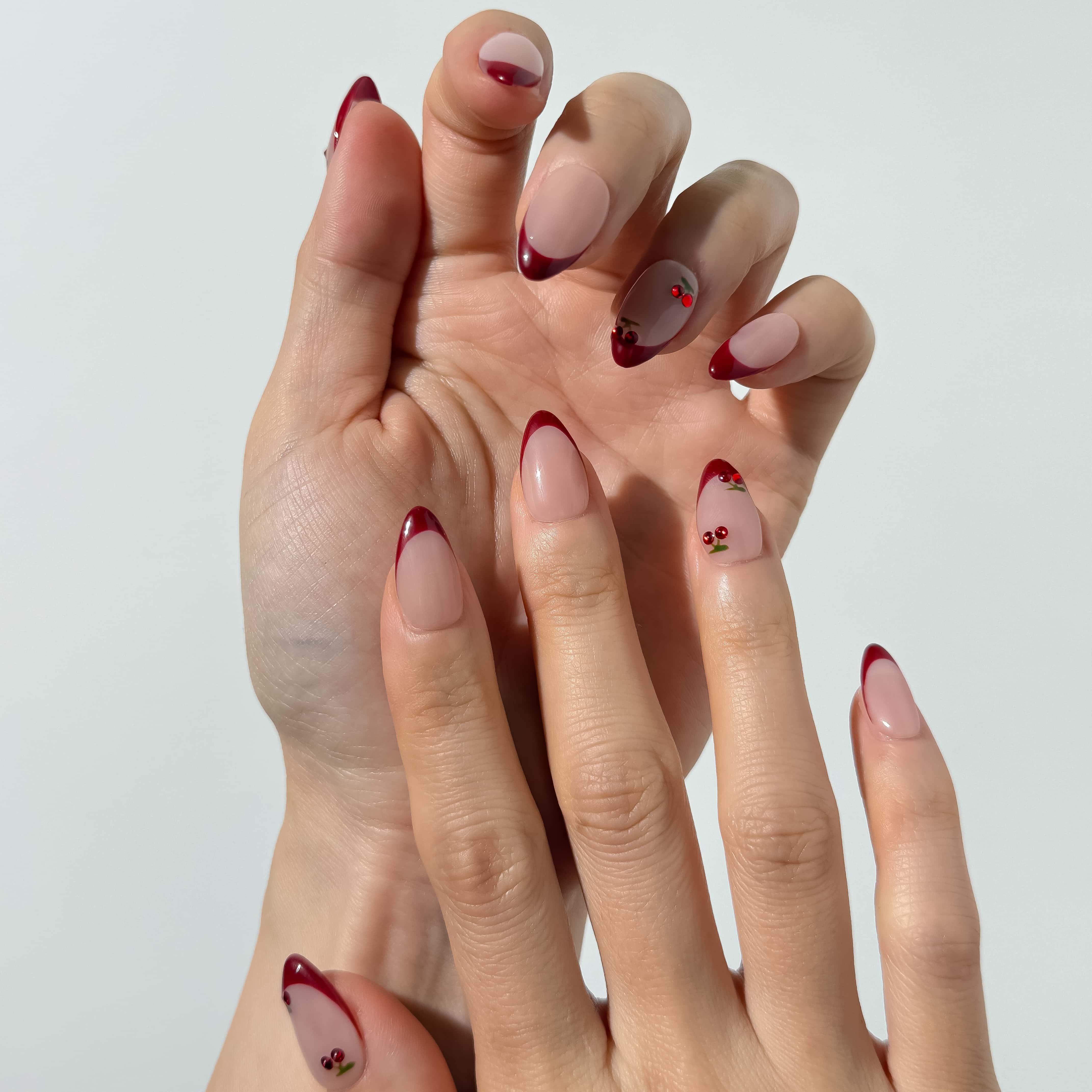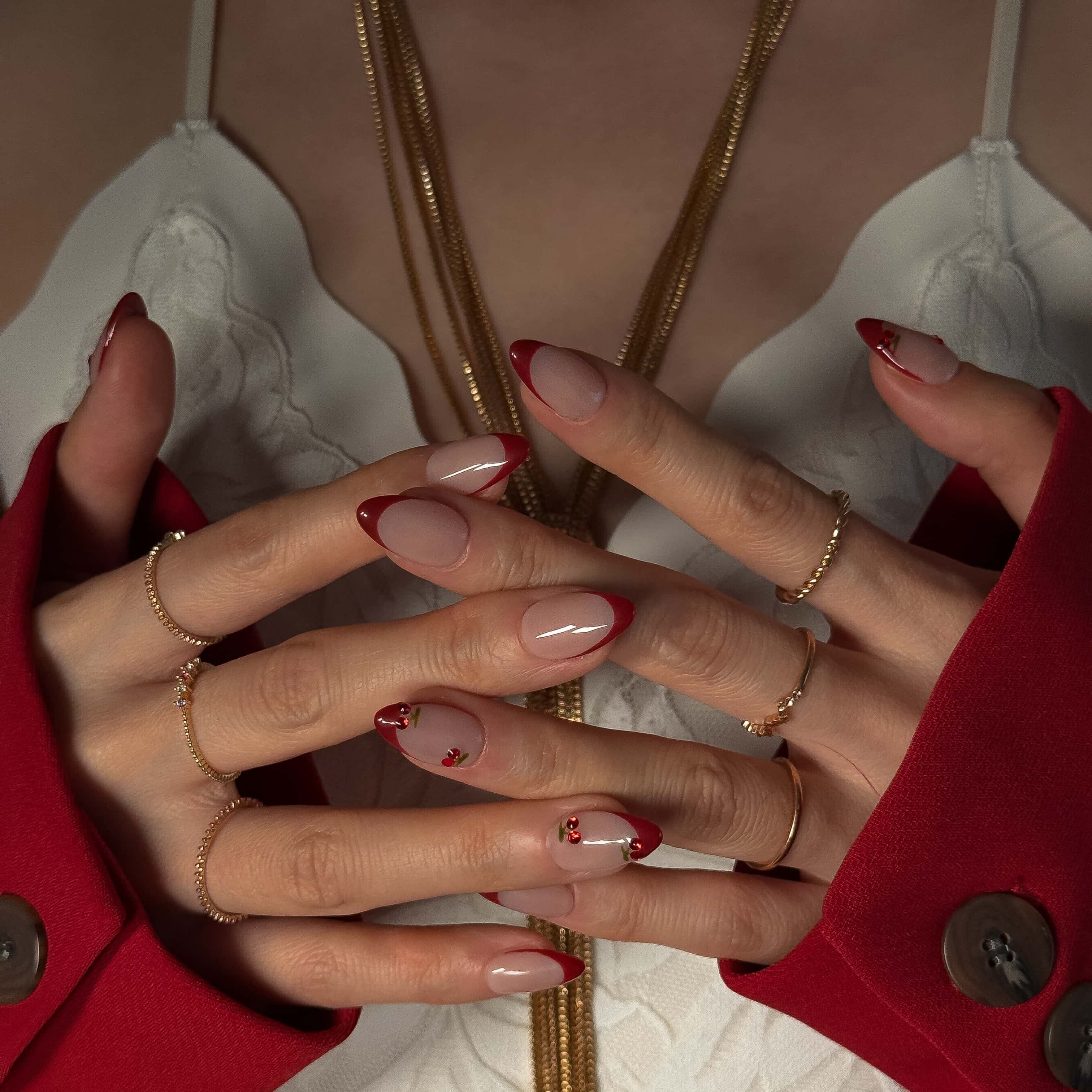 A playful twist on the classic French manicure. This vibrant red design is elevated with exquisite diamond cherry decorations, offering a whimsical fruit-inspired elegance.
