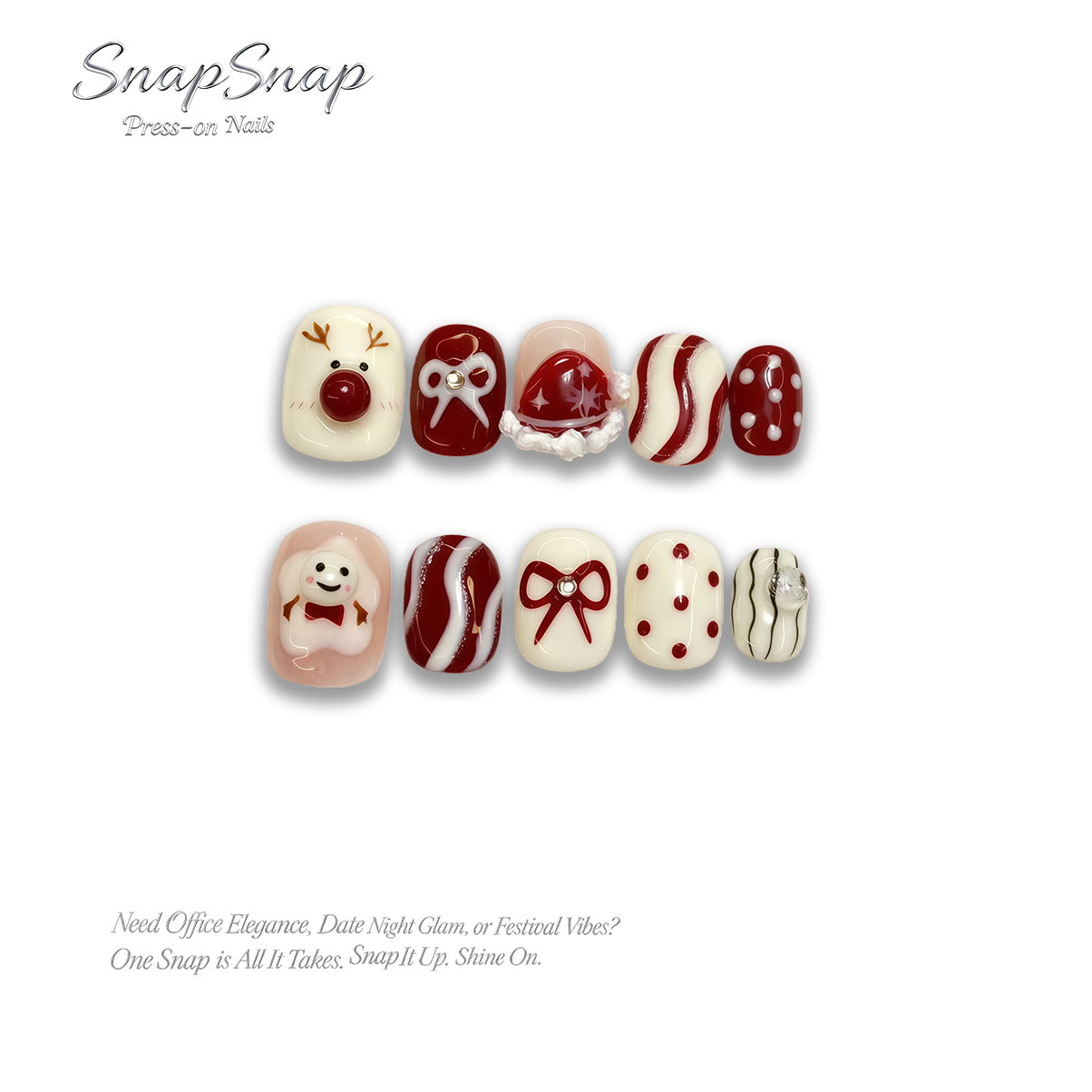 Featuring playful 3D elements like reindeer, snowmen, and Santa hats. Each nail is like a tiny, fun-filled Christmas celebration, full of childlike wonder.