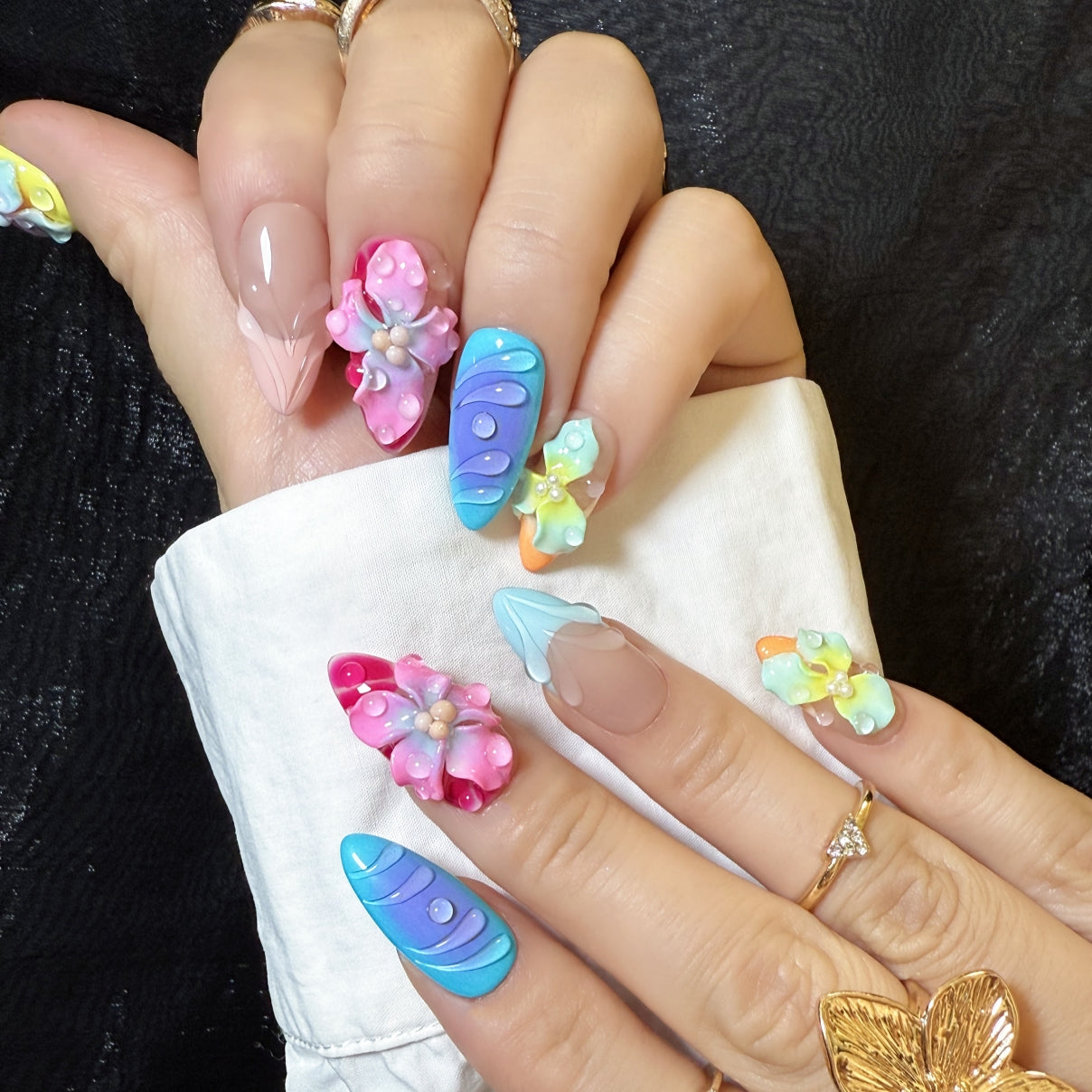 Vibrant blue greens and fuchsias burst forth in a tropical dance across the nails. This design captures the untamed energy of an exotic paradise in full, glorious bloom.