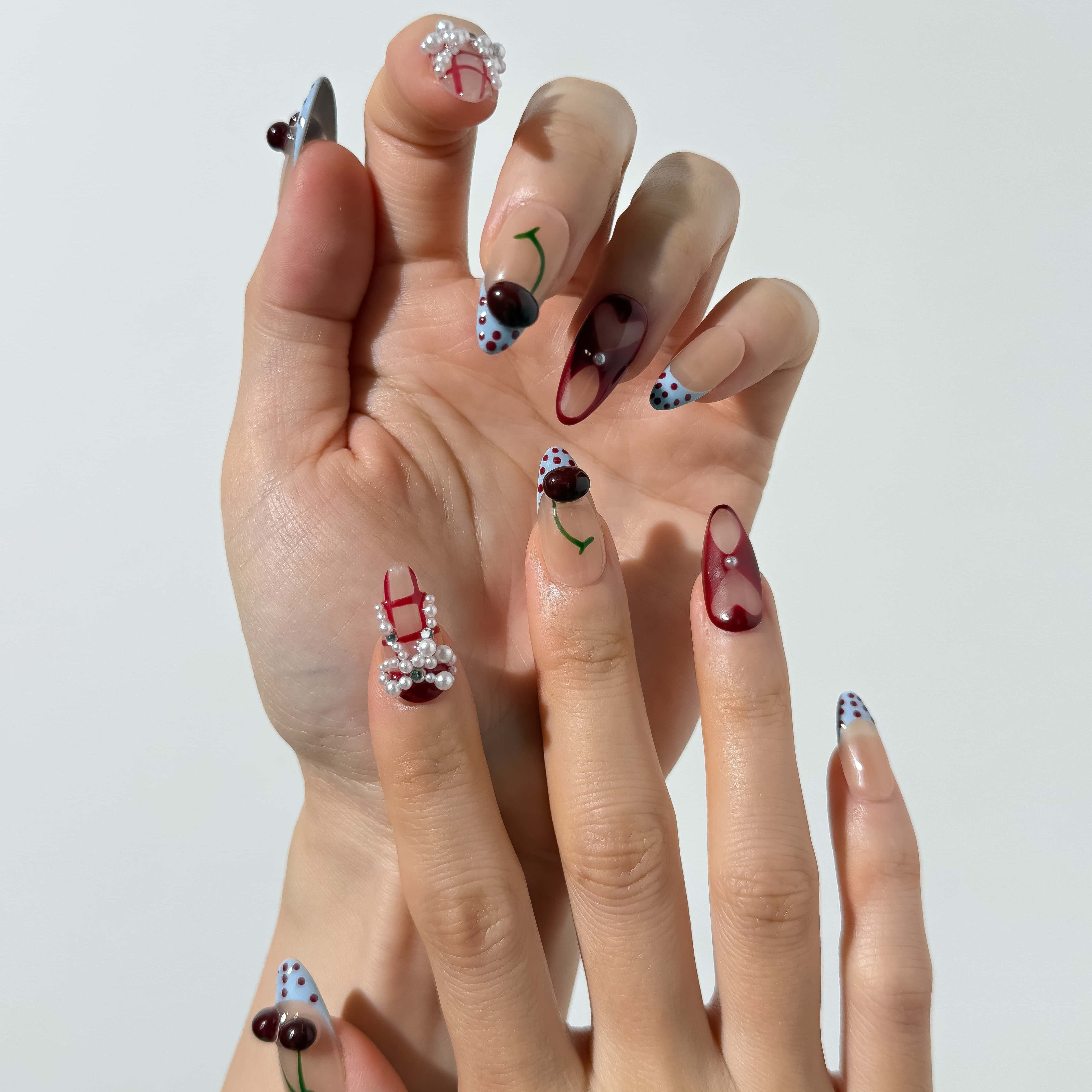 Indulge in the sweet-and-edgy charm of our Burgundy Cherry Sweet Pop Tart press-on nails. This set artfully blends playful elements into a cohesive, chic look. It features a sheer nude base adorned with 3D burgundy cherries for a juicy pop of texture. Accents include soft blue polka dots, classic red plaid paired with pearl and crystal embellishments, and a delicate burgundy heart sheer nail finished with a single pearl.