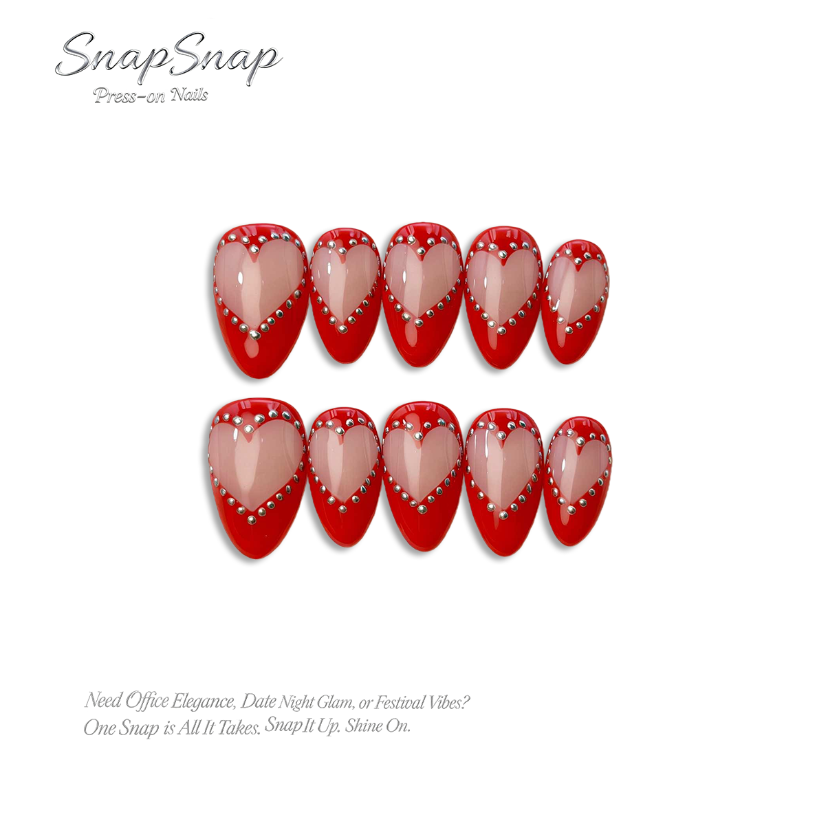 Indulge in a romantic statement with our Crimson Heart & Silver Dots almond-shaped press-on nails. This set masterfully plays with a bold contrast between a vibrant crimson and a soft, tender nude-pink.