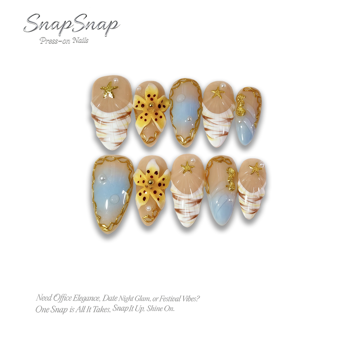With starfish, seahorses, shell patterns, and gold tracing, this style looks like a marine fairy tale brought to life with a gilded glow.