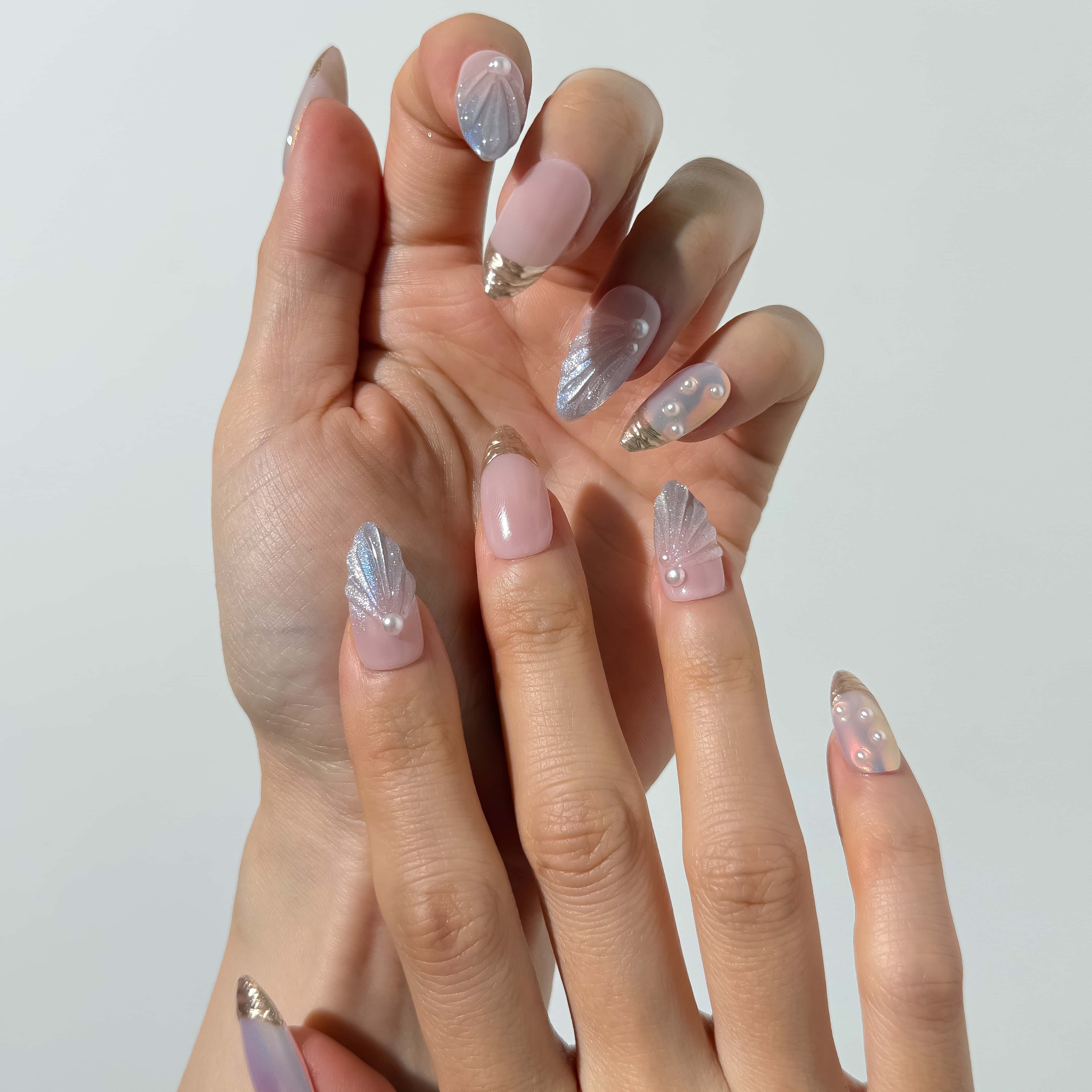Shells, pearls, and metallic textures intertwine in a symphony of luxury. This design is a gorgeous ode to the ocean, composed in light luxury.