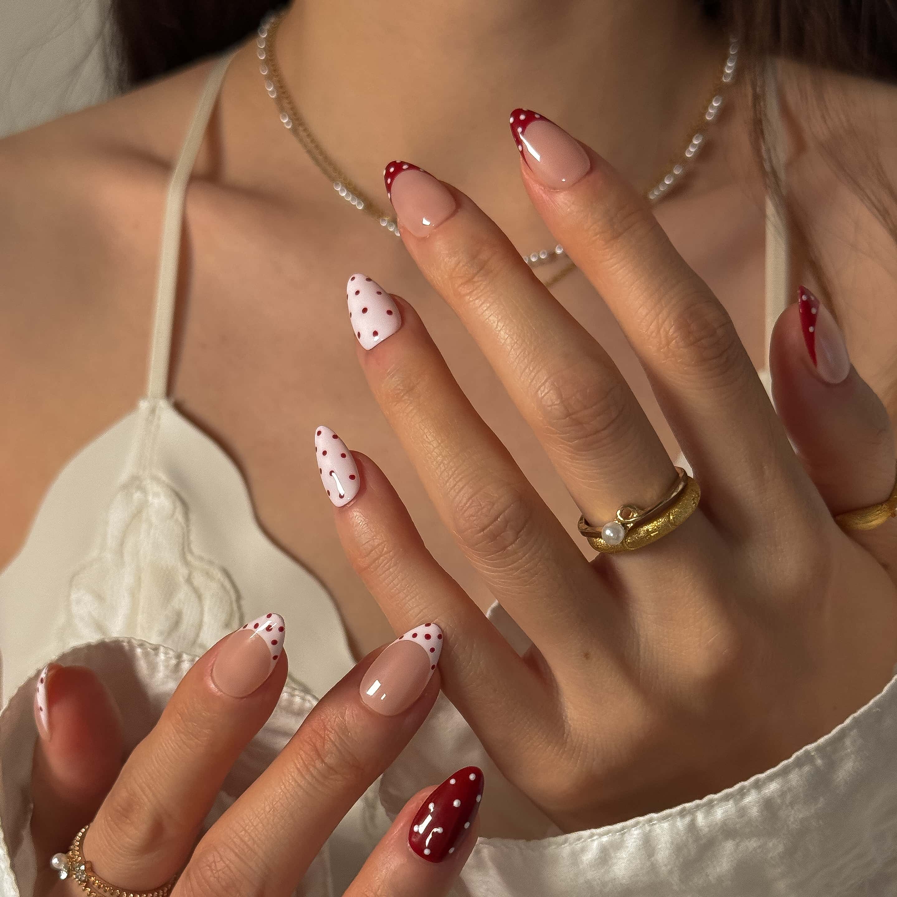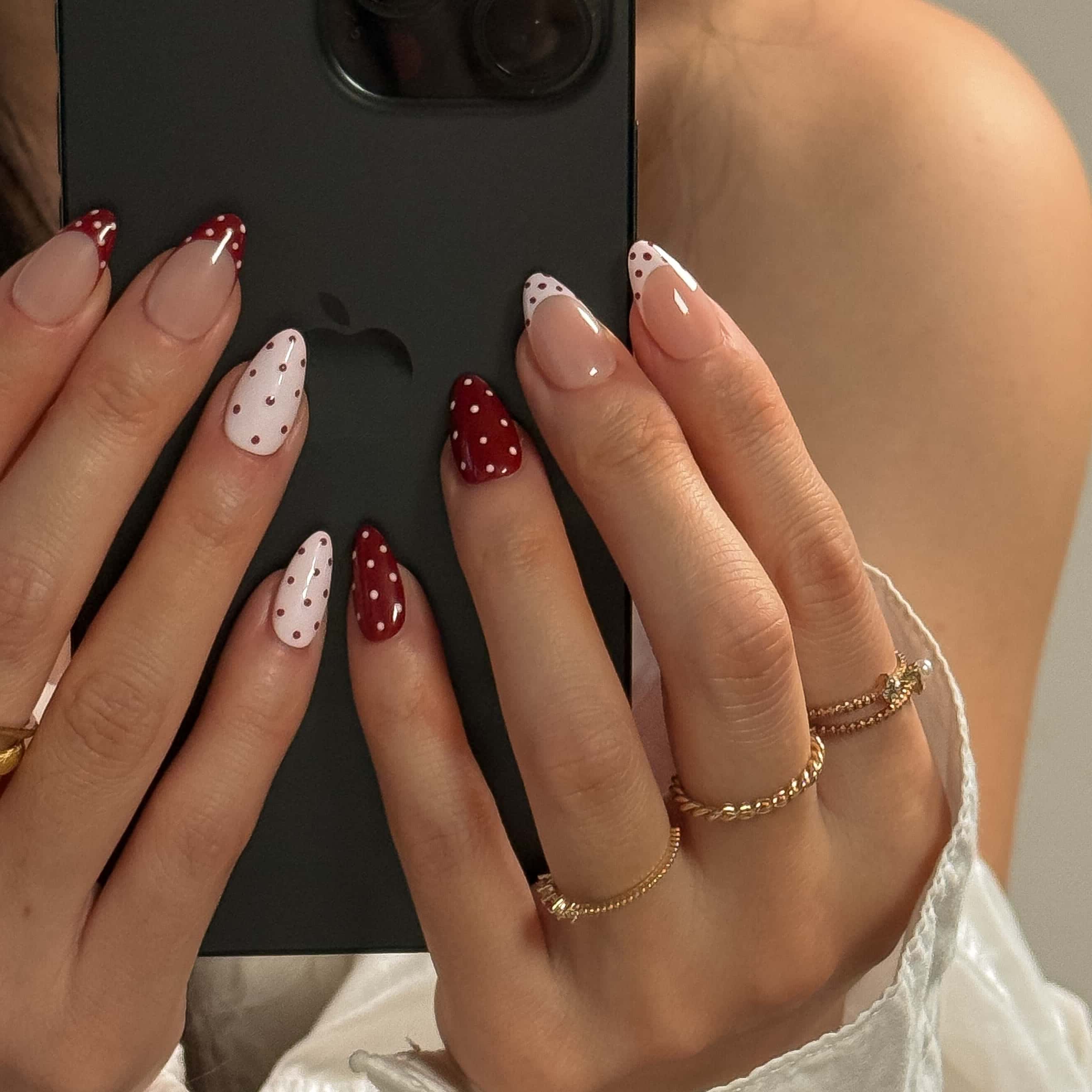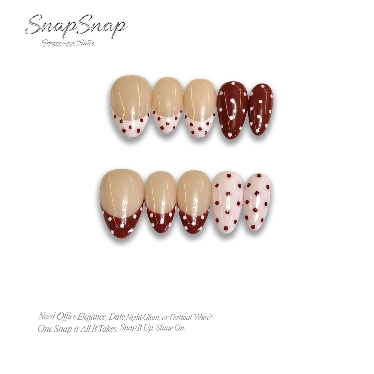 A nostalgic clash of milky tea brown and classic polka dots. It’s like wearing the gentle warmth of a bygone era on your fingertips.